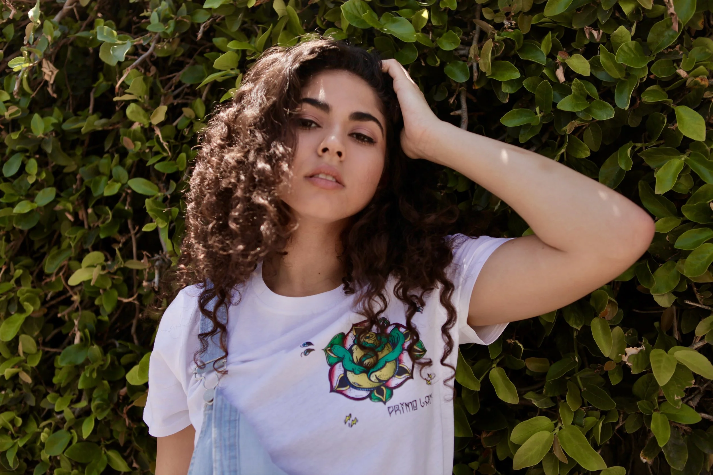 A young woman with curly brown hair lying against a background of green leaves, wearing a white T-shirt with a colorful tattoo-style design on the front and a light blue overall strap over one shoulder.