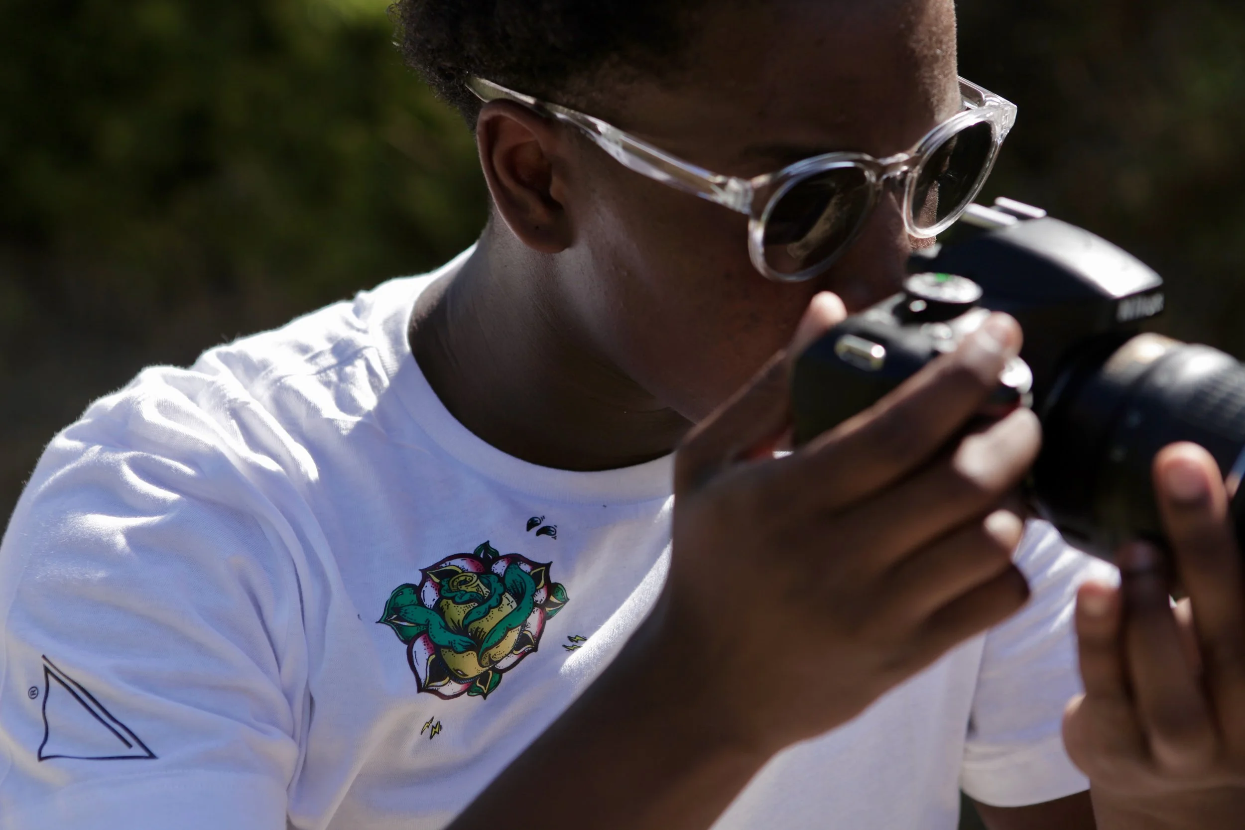 A young person with dark skin, wearing sunglasses and a white t-shirt with a colorful graphic, is looking through a camera with a zoom lens, outdoors with blurred background.