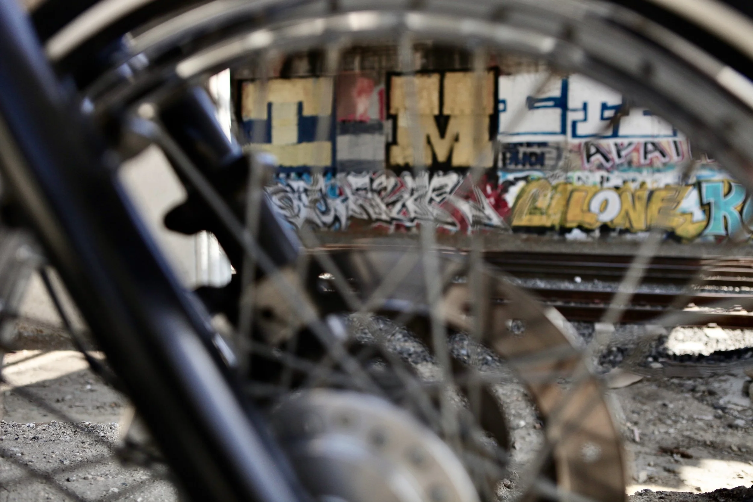 Close-up of a motorcycle wheel with graffiti-covered railroad tracks in the background.