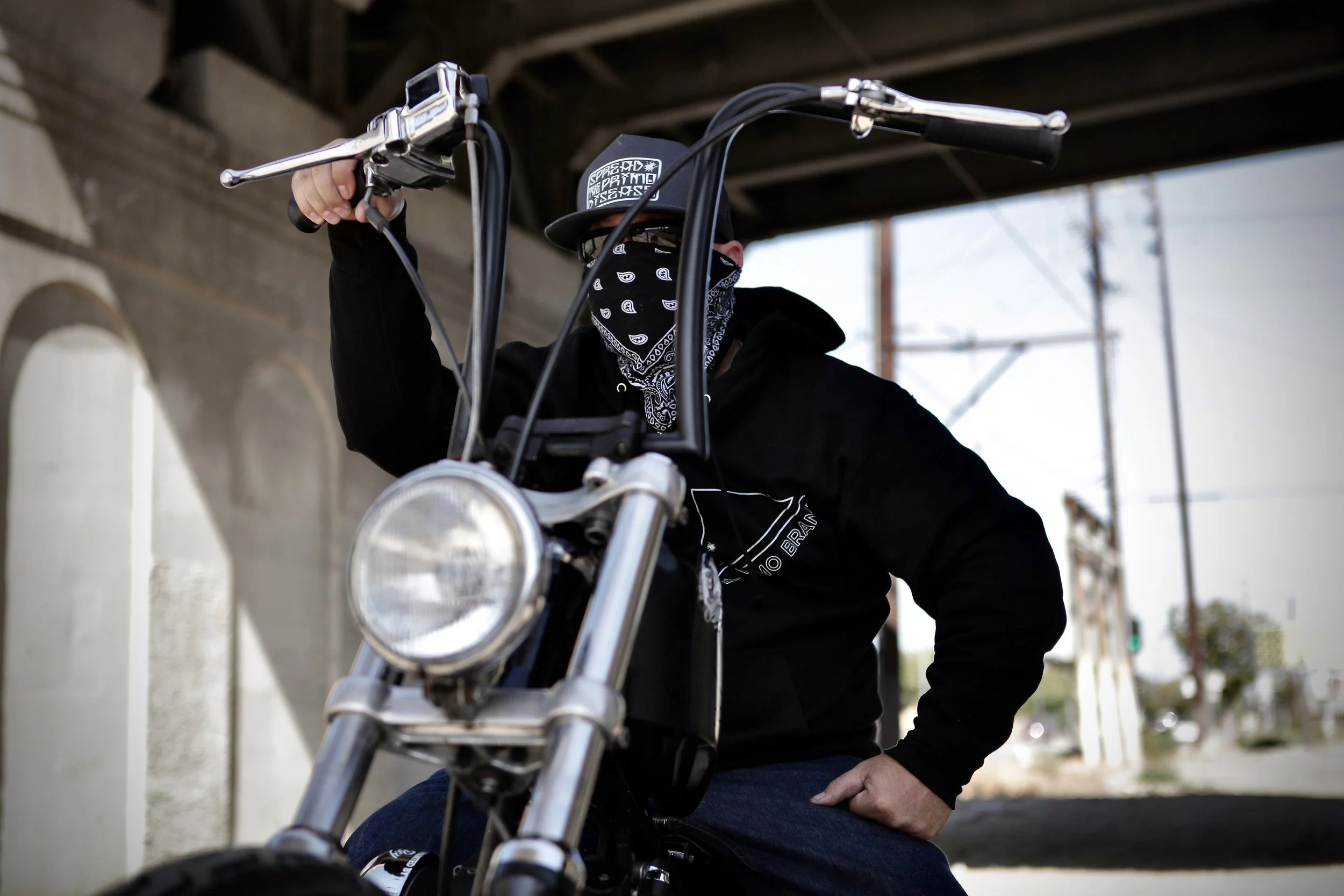 Person wearing a black hoodie, bandana face covering, and dark cap sitting on a motorcycle under a bridge.